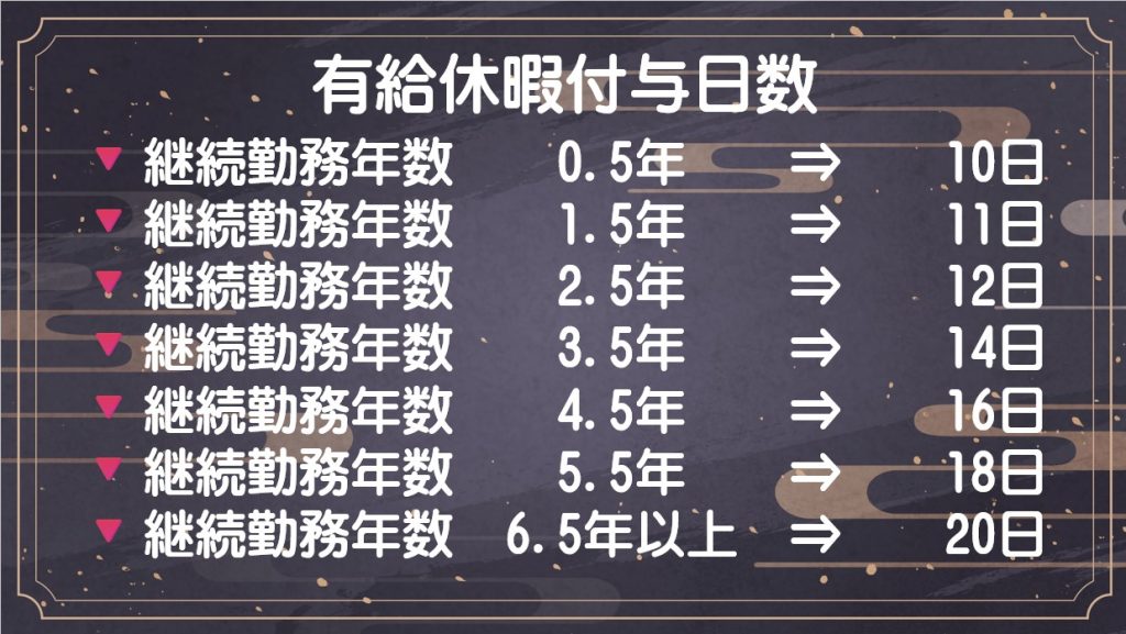 有給休暇の付与日数は取得後から1年ごとに最大20日まで付与されます。